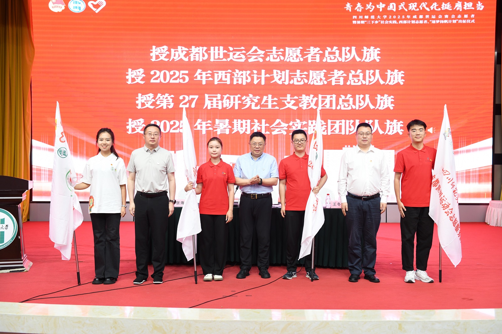 全面保障,暖心护航。学校成立赛会志愿服务工作领导小组,下设7个专项工作组,并印发专项工作方案,明确责任分工,6月18日、7月1日分别召开工作推进会及领队会议部署落实。7月2日,学校隆重举行志愿者出征仪式,学校领导、世运会执委会及团市委相关领导到场指导。仪式上宣布成立临时党团组织强化引领,并为志愿者总队授旗,标志着川师服务力量正式出征。为保障服务,学校实行在校集中住宿、统一管理,确保住宿区水电、医疗等保障有力。学校同步开展暖心关怀,发放“志愿者能量加油大礼包”,组建心理健康保障队伍提供“一对一”指导,策划“志愿者之夜”活动丰富留校生活、缓解压力。学校领导于7月21日、30日分别前往宿舍及开幕式场馆“天府之檐”亲切慰问志愿者。