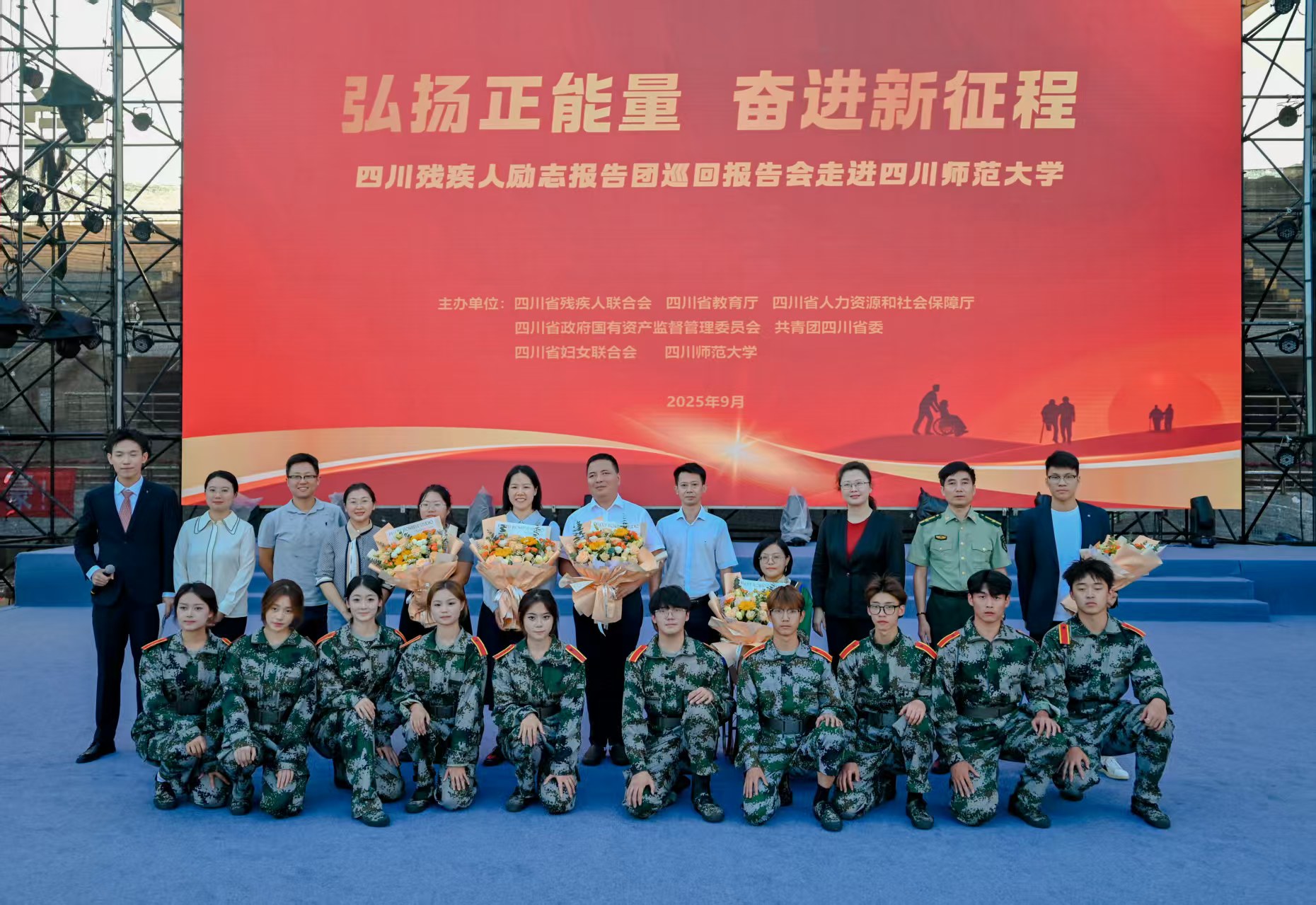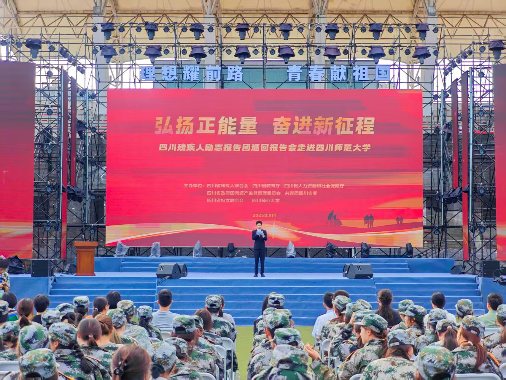 9月24日,由四川省残联、教育厅、人力资源和社会保障厅、省国资委、团省委、省妇联和我校联合举办的“弘扬正能量 奋进新征程”四川残疾人励志报告团巡回报告会在我校成龙校区第三运动场举行。4000余名大一新生聆听了宣讲报告。校党委常委、副校长何诣然出席并致辞。