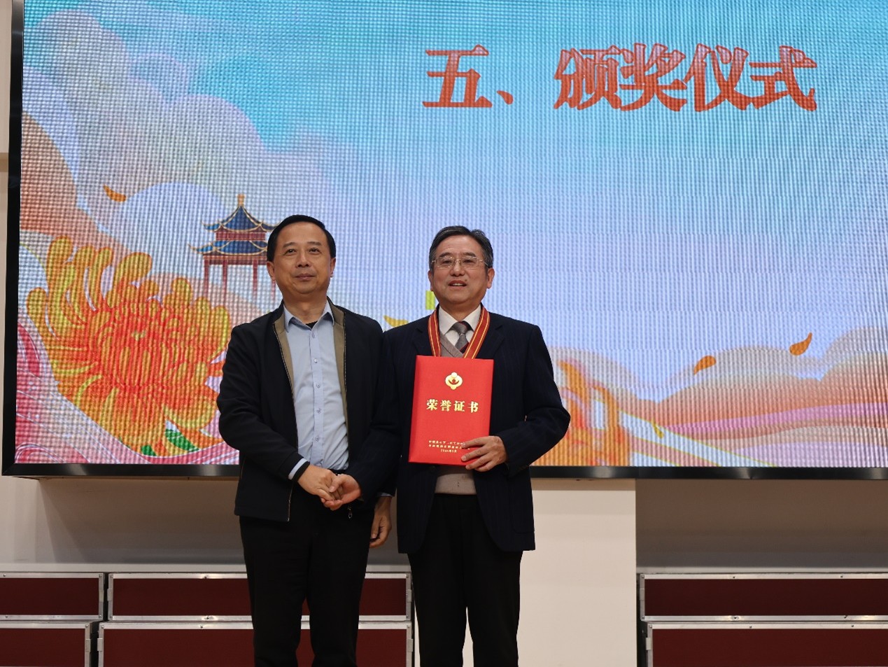 蒋文涛代表学校向全体老同志致以节日问候,感谢大家长期以来对学校事业发展的关心与支持。他在讲话中阐述了重阳节的文化内涵,传达了党和国家对老年群体的关怀政策,介绍了学校在精准服务老同志方面所做的具体工作,并充分肯定了老同志在学校发展中所发挥的积极作用。接着为荣获“全国关心下一代工作先进工作者”称号的黄尚军老师颁发了证书。
