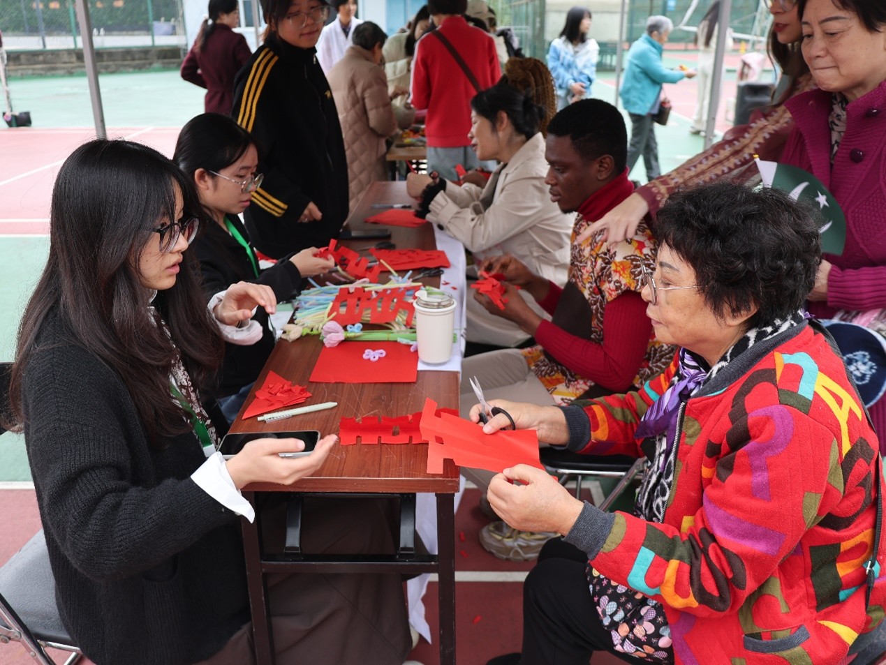 仪式结束后,校园健步走活动在桃李园生态广场正式进行。学生社团在第二运动场组织了扭扭棒手工、艺术剪纸等活动,留学生还为老同志提供了海娜手绘、民族服饰试穿等文化体验,营造了运动、交流与文化融合的良好氛围。
