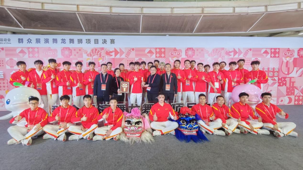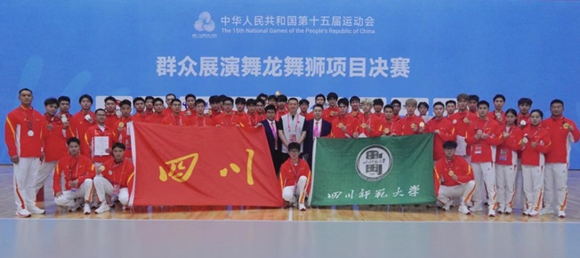 11 月 11 日至 14 日,在广东佛山举行的第十五届全运会群众展演舞龙舞狮项目决赛中,我校龙狮队代表四川省首次参赛,共摘得两金一银一铜的好成绩,分别拿下舞龙障碍项目金牌、北狮自选项目金牌、舞龙自选项目银牌和舞龙规定项目铜牌。
