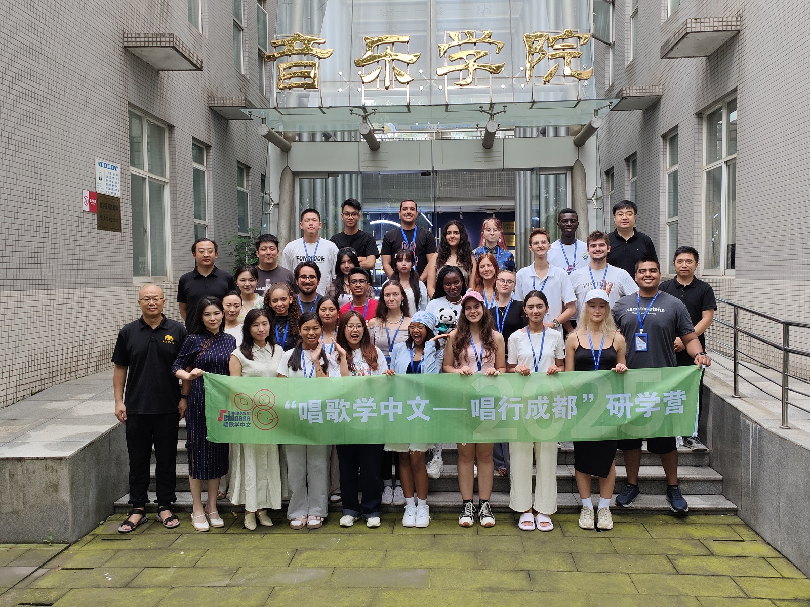 近日,由教育部中外语言交流合作中心主办、我校承办的2025年“唱歌学中文——唱响成都”来华研学营顺利结营。来自美国、德国、泰国、阿根廷、赞比亚等18个国家的25名热爱音乐的中文学习者参与本次活动。研学期间,学员们通过古蜀文明探秘、民乐体验、歌词创作、合唱交流及结营歌会等多种形式,在歌声与实践相结合中学习中文,深入体验巴蜀文化的独特魅力。