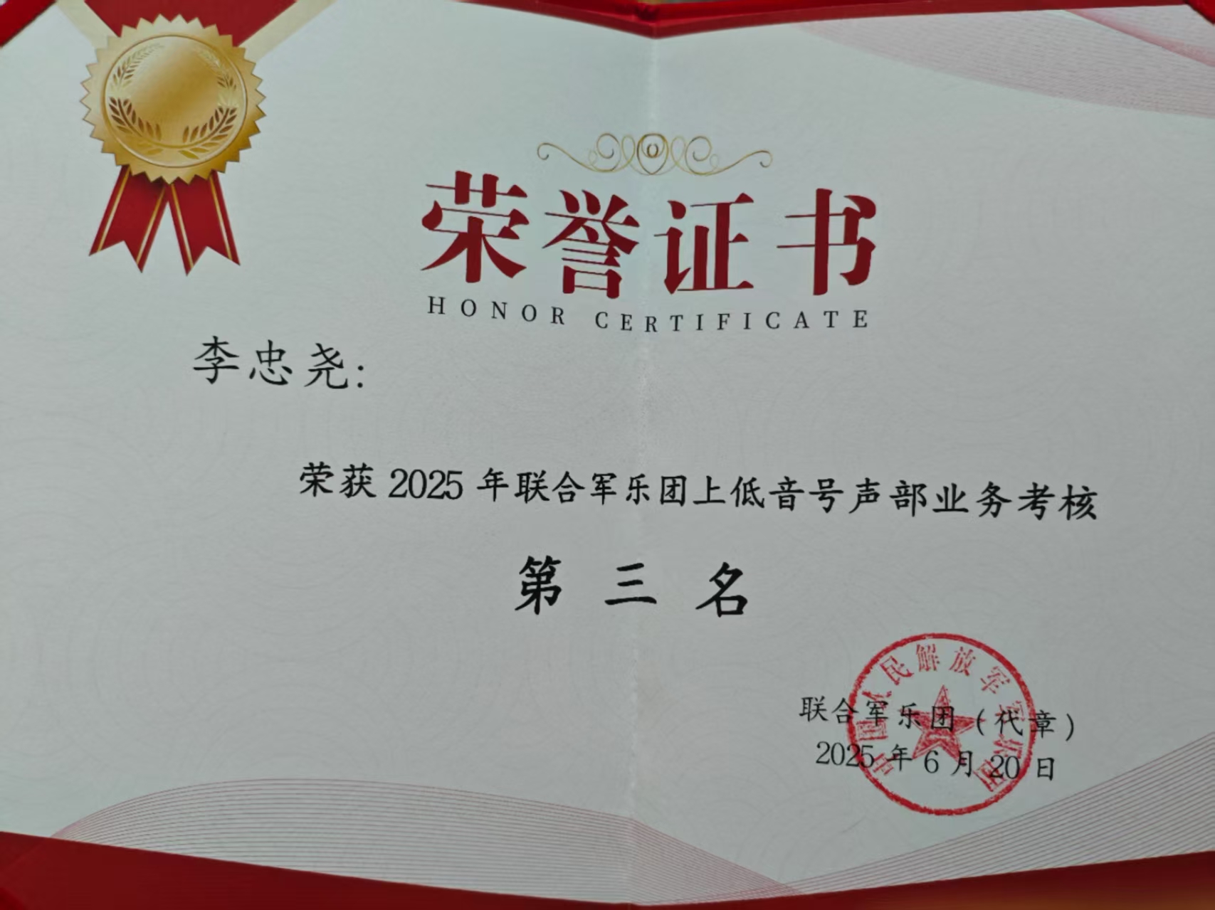 为圆满完成此次任务,李忠尧历经近百天高强度训练。在北京七月高温中,每日坚持长时间站立排练,经受身体与意志的双重考验。他在声部考核中取得全团第三的优异成绩,训练期间表现突出、持之以恒。