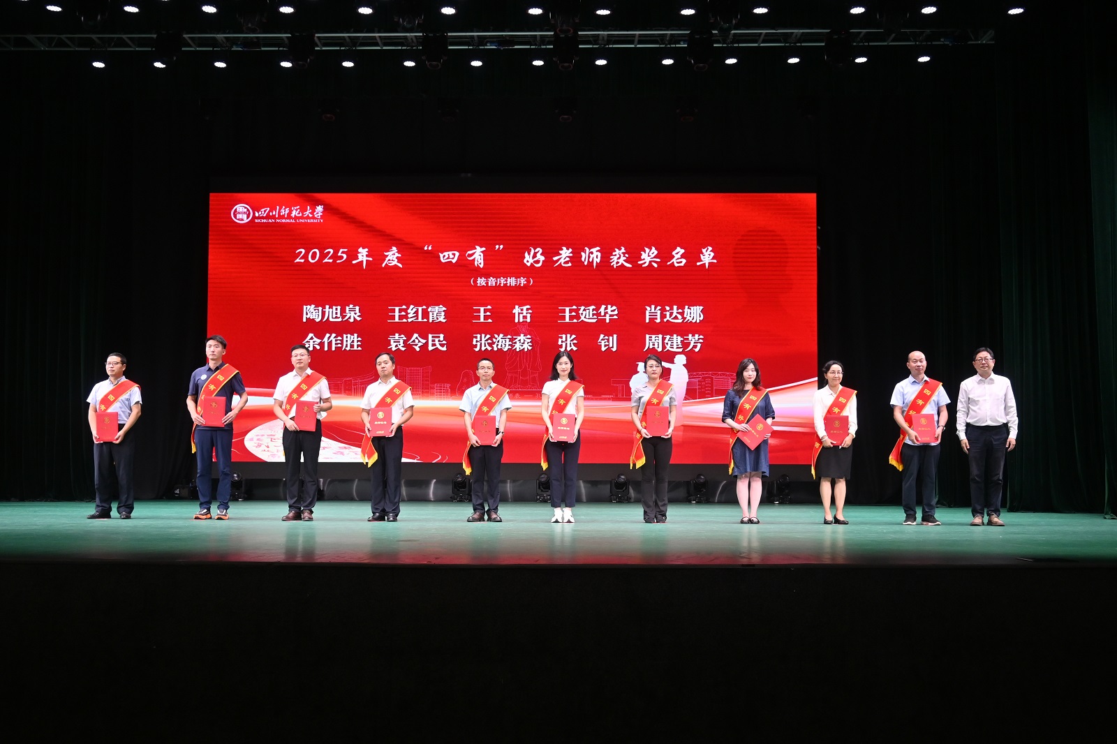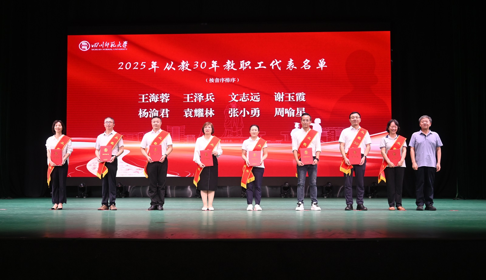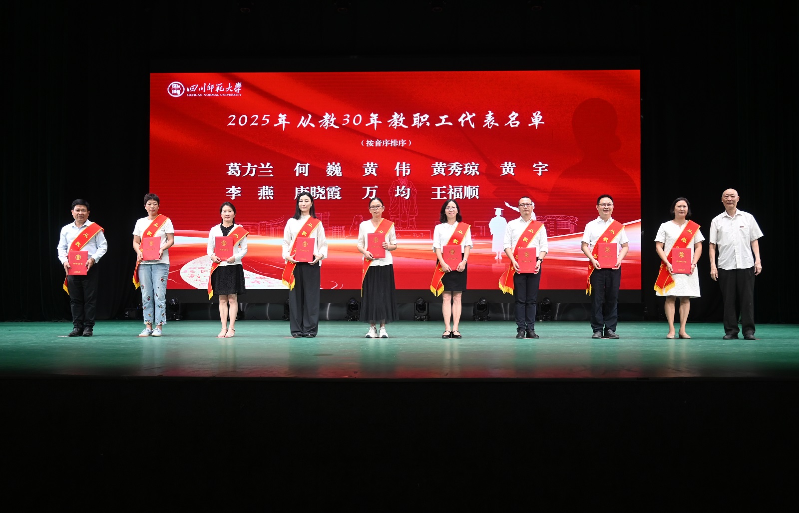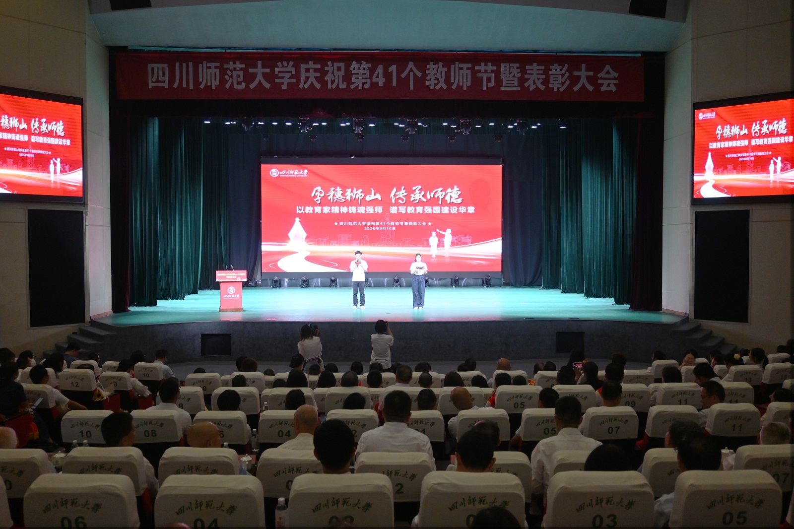 教育大计,教师为本。9月10日下午,学校在成龙校区龙湖剧场隆重举行庆祝第41个教师节表彰大会,集中表彰奋斗在学校各条战线、各个领域和各项工作中的标兵模范,进一步弘扬尊师重教的良好风尚,激励广大教师坚守育人初心、担当时代使命。四川省教育厅一级巡视员傅明,全体校领导、部分退休老领导出席大会,各职能部门、教学单位、研究平台、教辅单位主要负责人,获奖教师代表、师生代表参加大会,遂宁校区师生代表在线参会。大会由校长赵国华主持。