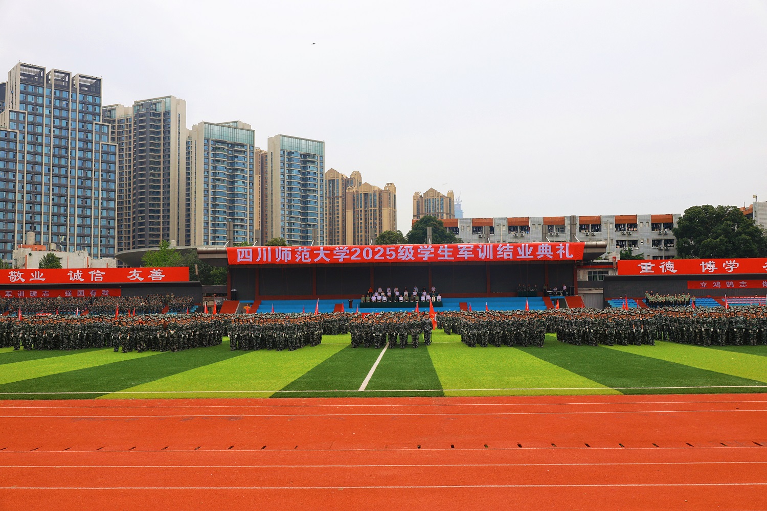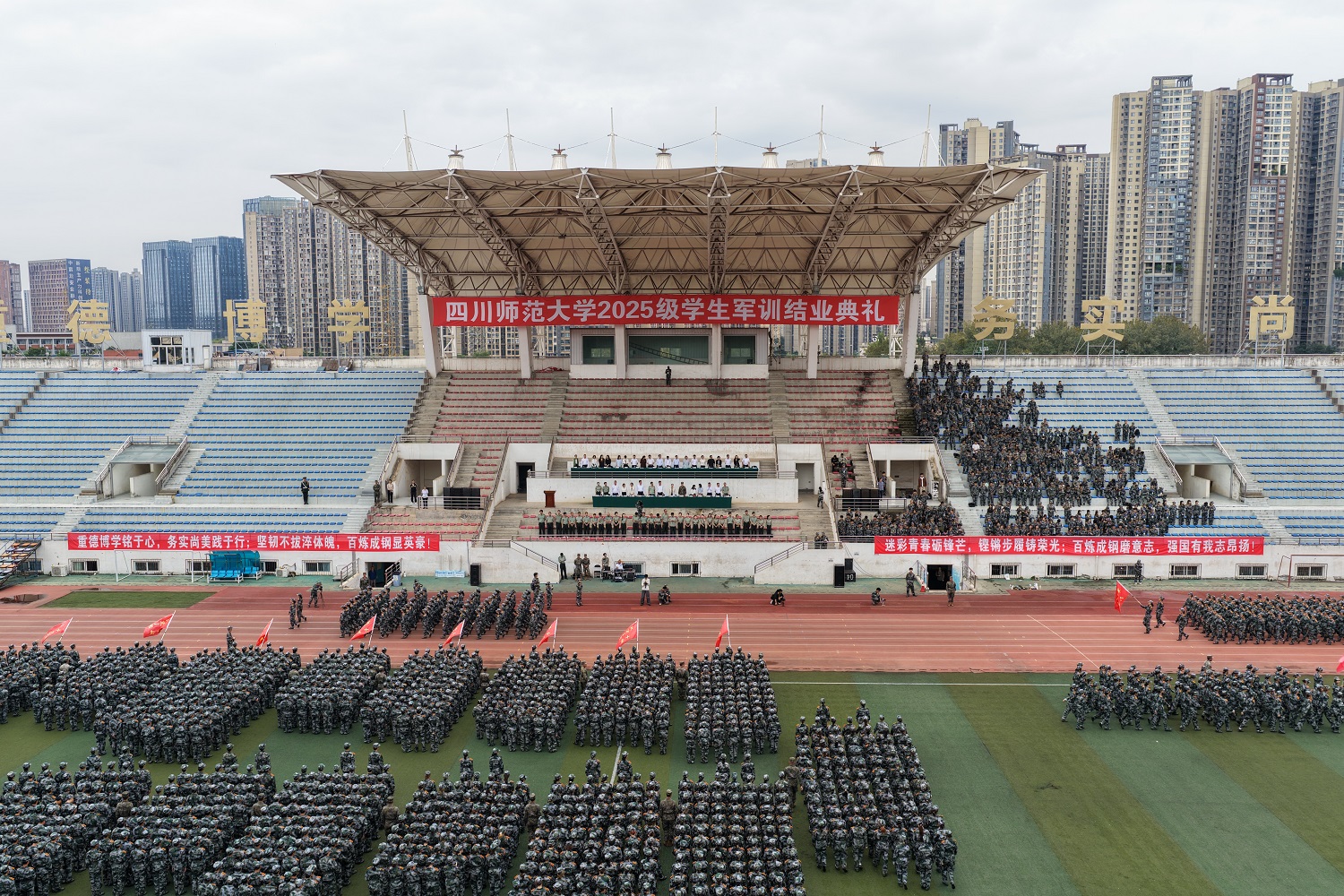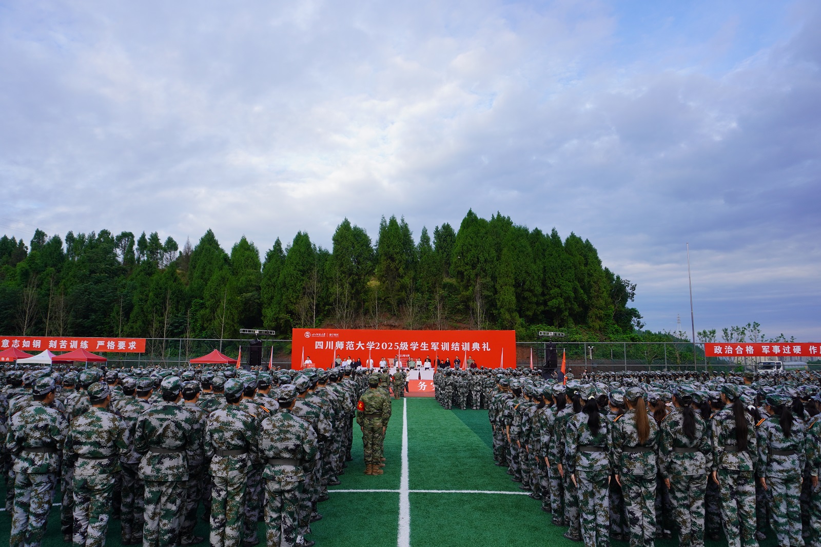 9月30日上午,学校在狮子山、成龙和遂宁三校区同步举行2025级新生军训结业典礼。校党委书记郭勇,校长赵国华,校党委副书记张海东,副校长郭朝辉、何诣然分别出席典礼。武警四川省总队成都支队、成都市锦江区人民武装部相关负责人,学校全民国防教育及动员工作领导小组各成员单位、各学院(校区)负责人,全体教官、带训干部、参训学生参加典礼。