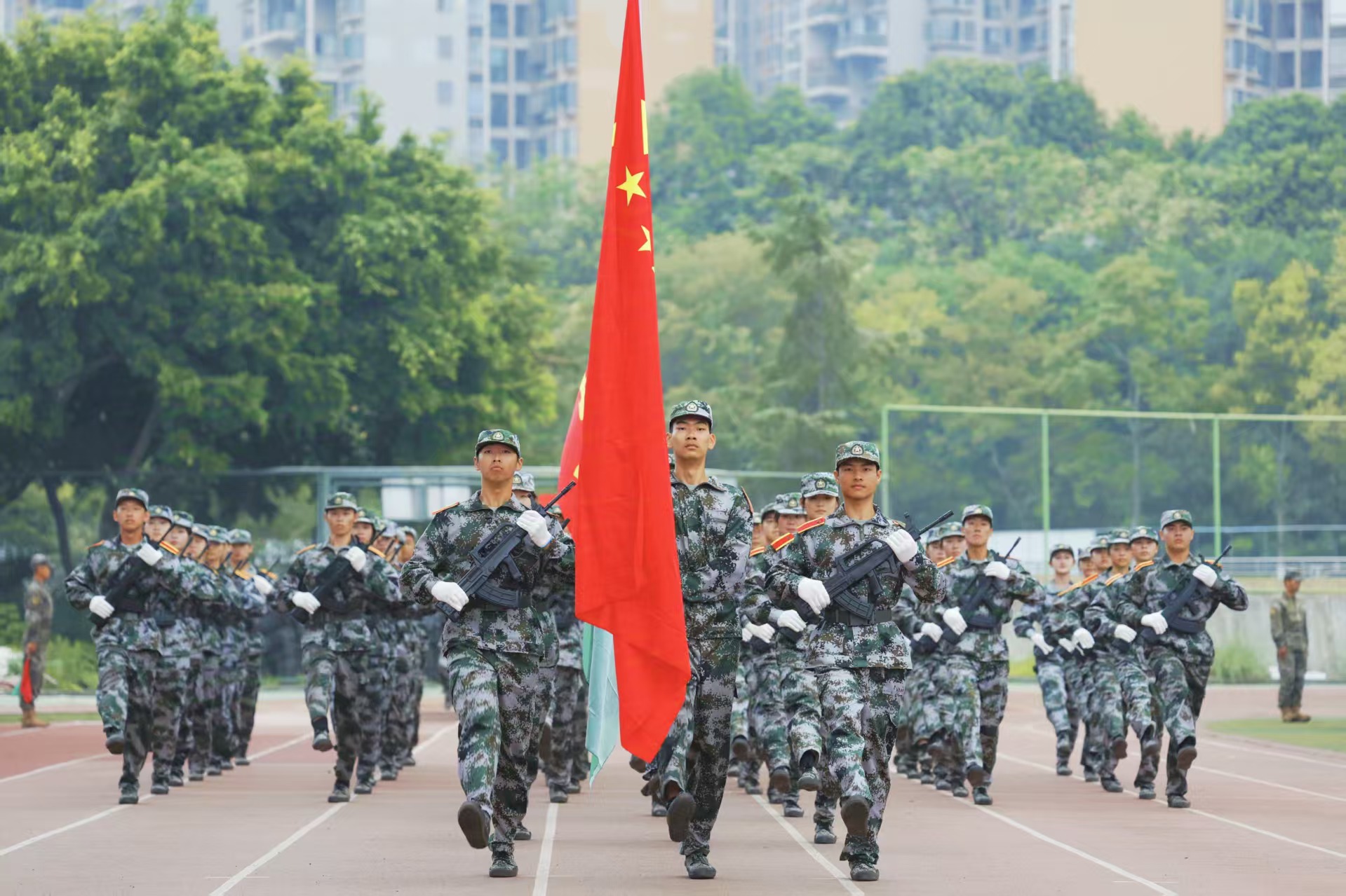 郭勇、赵国华、何诣然在讲话中向承训部队、全体教官、带训干部、后勤及医护人员表示感谢,对受嘉奖的先进个人和圆满完成军训的同学们表示祝贺。他们指出,本次军训以爱国主义教育为核心,围绕“强信仰、严纪律、重养成、提素质”目标,强化思想引领与科学训练,弘扬了伟大抗战精神。他们表示,全体教官和带训干部科学施训、严格管理、率先垂范,参训同学认真学习、刻苦训练、奋勇争先,以昂扬的斗志高质量完成了各项训练任务。他们勉励同学们将军训中养成的纪律意识、集体观念和精神品格,转化为坚定理想信念的精神动力、深耕专业领域的钻研劲头、主动担当作为的奋斗行动,在强国建设中贡献青春力量。