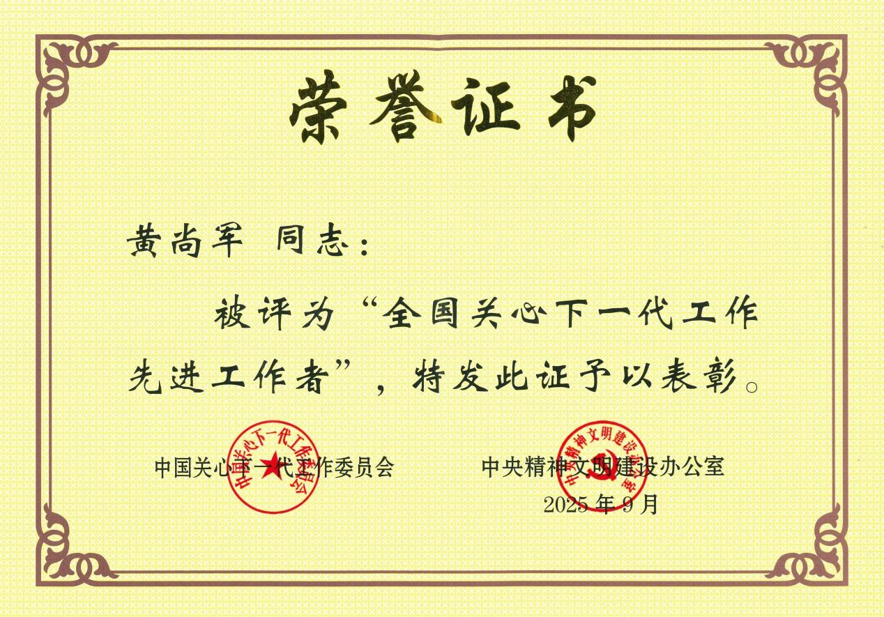 黄尚军教授此次获评“全国关心下一代工作先进工作者”,既是对他长期以来甘于奉献、倾心育人的高度认可,也是对我校关工委在支持青少年成长成才方面积极贡献的充分肯定。我校关工委将继续大力弘扬“五老”精神,聚焦立德树人根本任务,努力培养德智体美劳全面发展的社会主义建设者和接班人,为以中国式现代化推进强国建设、民族复兴伟业注入更多师大力量。