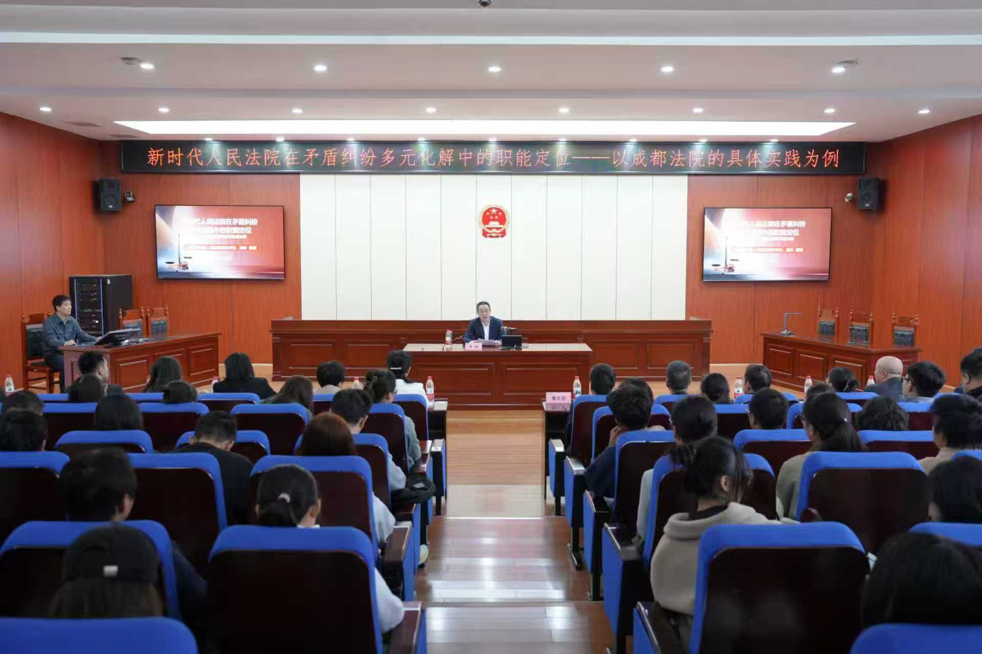 在与会嘉宾的共同见证下,郭琳佳与陈佑松分别代表双方签署合作框架协议。杨诚与郭勇共同为“法学实践教学与科研基地”揭牌,标志着校院合作正式启动。签约揭牌仪式后,郭勇陪同杨诚一行参观了青少年法治教育中心。随后,杨诚在校园法庭为师生作题为《新时代人民法院在矛盾纠纷多元化解中的职能定位——以成都法院具体实践为例》的专题讲座。