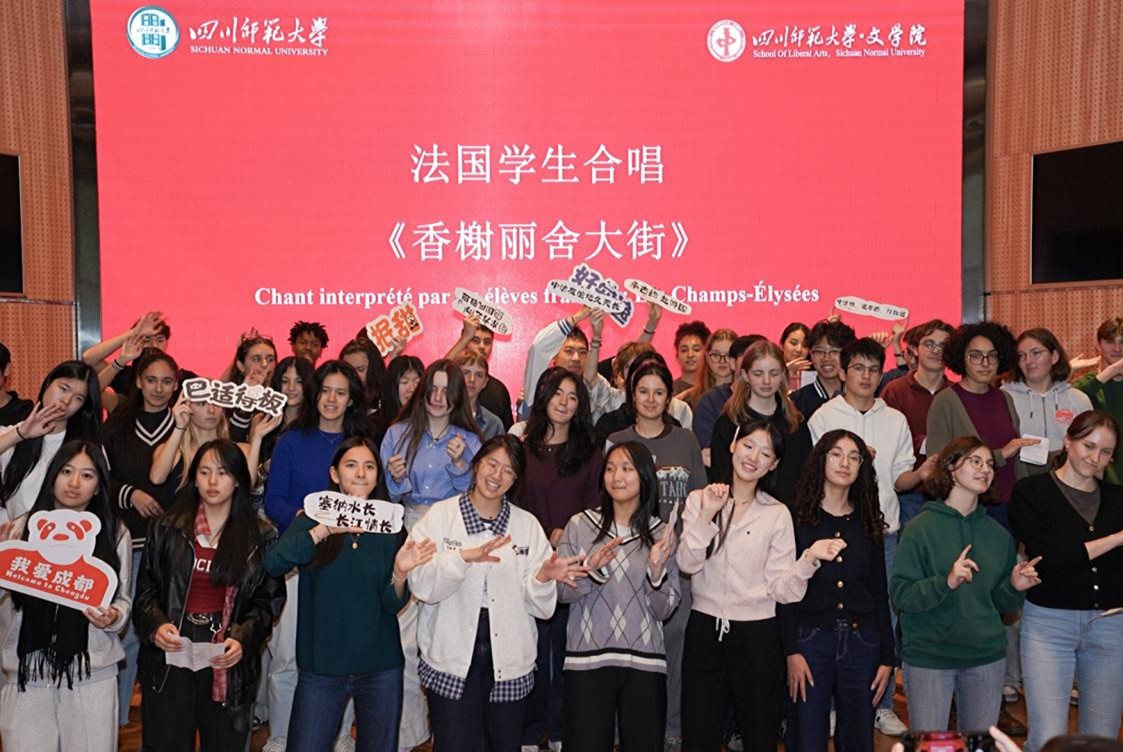 仪式以一段精彩的访学回顾短片开篇,生动呈现了法国学生在书法课堂、熊猫基地、川菜博物馆、西安古城墙等地的文化体验历程,展现了他们深入感知中华文化的丰硕收获。在文艺展演环节,法国学生演唱了《香榭丽舍大街》,中法学生联袂献唱《送别》,法国学员小组还表演了《在热带阳光下》,现场气氛热烈,掌声不断。
