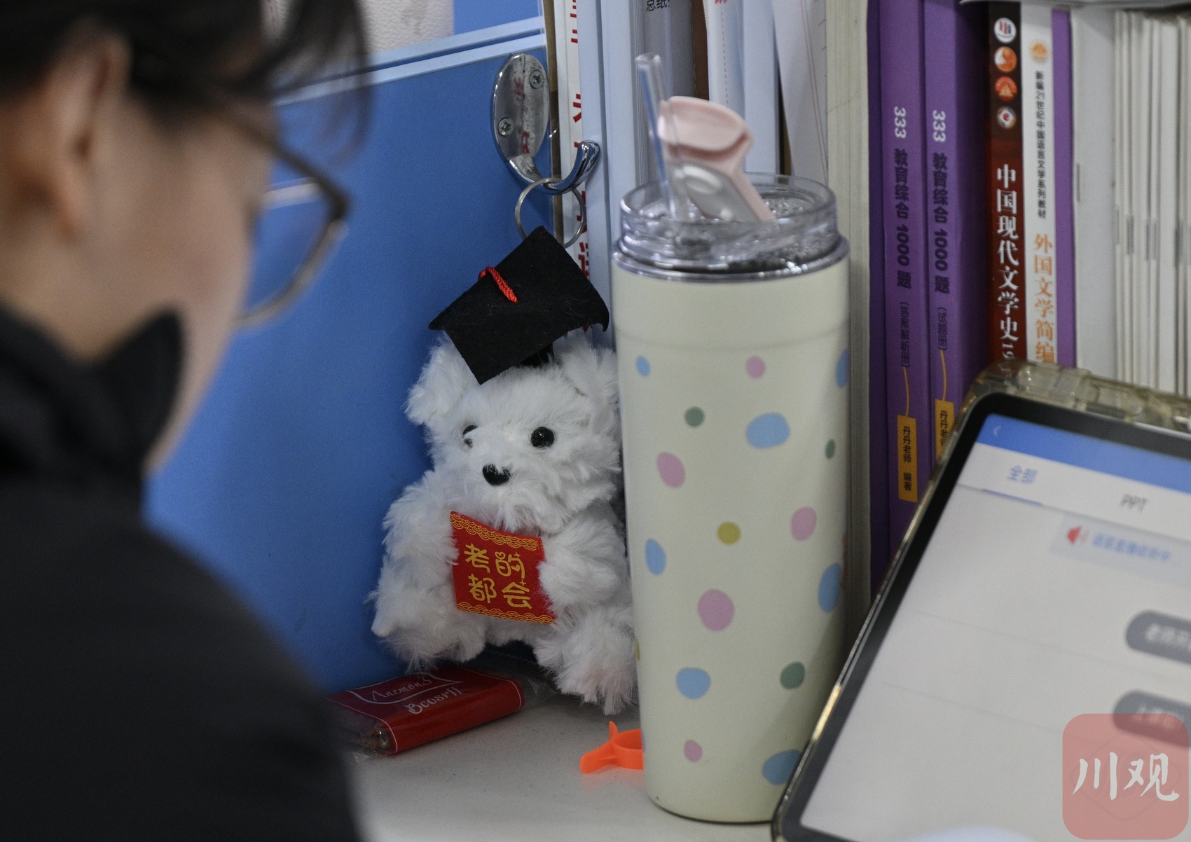 一名学生将一个印“考的都会”的玩偶挂在自习桌上,时刻鼓励自己。