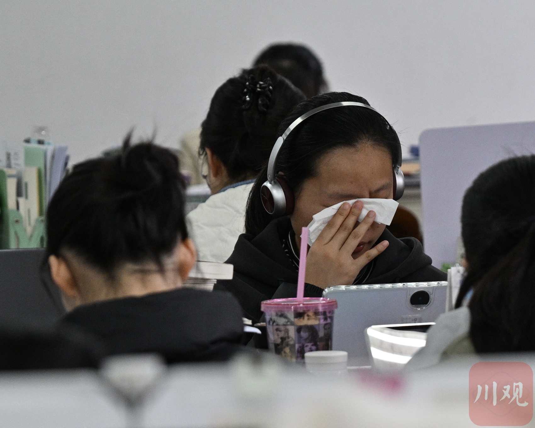 一名学生在图书馆自习室里用纸巾擦拭干涩的眼睛。