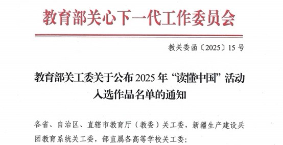 近日,教育部关工委公布2025年“读懂中国”活动评选结果。由我校关工委、党委研究生工作部创作的微视频《成昆线上“不灭的灯盏”》荣获“最佳微视频”奖项,学校关工委荣获2025年“读懂中国”活动表扬单位。
