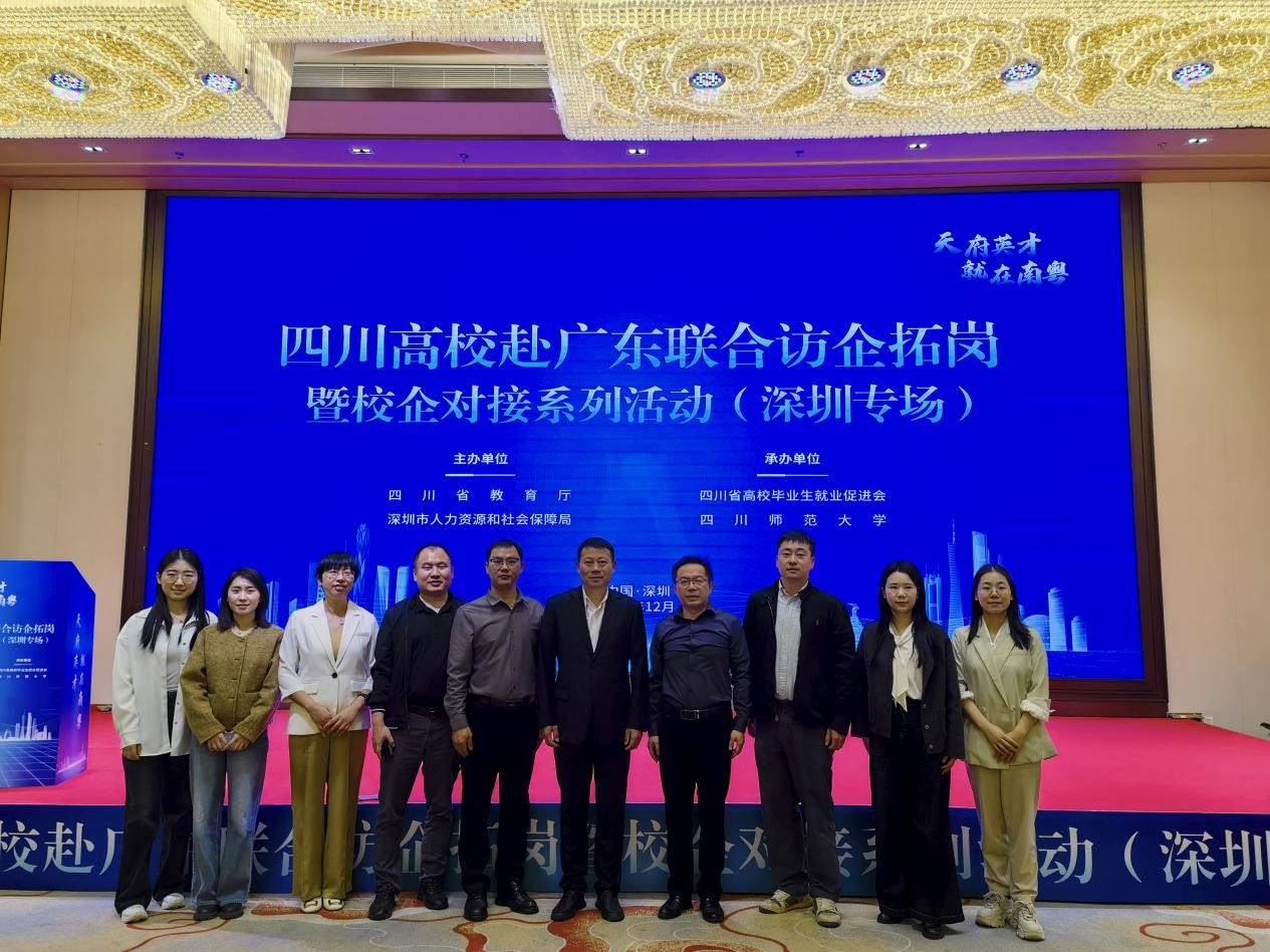 12月17日,由四川省教育厅主办、我校承办的四川高校赴广东联合访企拓岗暨校企对接系列活动(深圳专场)顺利举办。四川省教育厅党组成员、副厅长丁念友,深圳市人力资源和社会保障局党组成员、副局长吴军军等领导出席,全省29所高校、深圳163家重点企业及教育单位代表共300余人参会。活动期间,高校代表分组走访深圳医药、高科技人工智能企业及教育单位,并举办集中对接会,在实习实训、联合培养、定向招聘等多领域达成合作意向,助力川深人才协同发展。我校招生就业处处长庄开明以“川师人才 粤动未来”为主题作专题推介,全面展示学校人才培养成效。