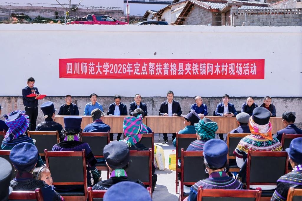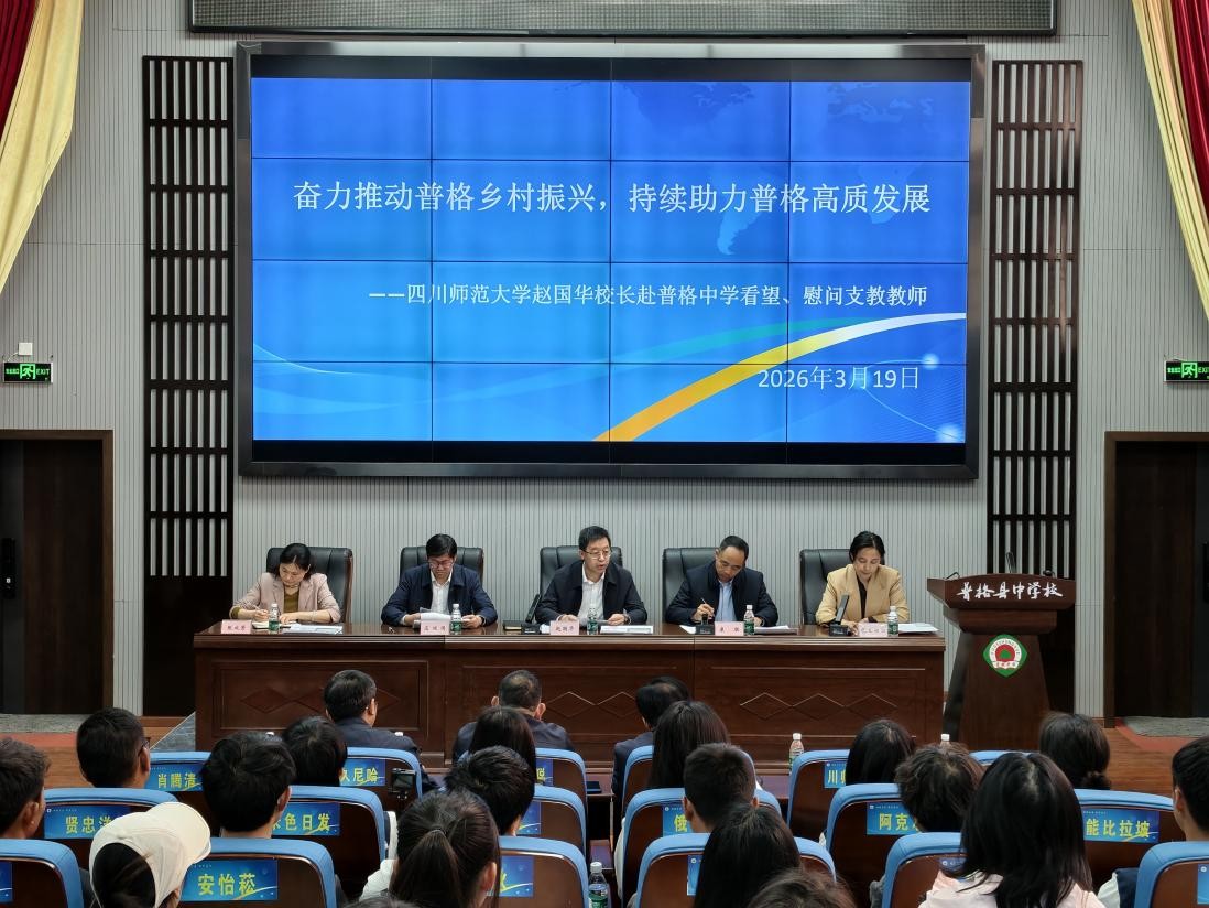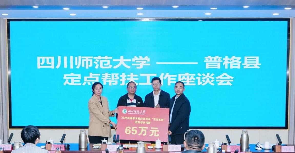 赵国华对普格县各级干部群众给予学校的信任与支持表示感谢。他指出,“十四五”期间,学校充分发挥教育、人才、文化等综合优势,构建起全方位、多层次、可持续的帮扶体系。在教育帮扶方面,累计选派上千名学生赴普格县顶岗支教,深入实施体育美育浸润行动,持续开展推普助力乡村振兴活动,为当地教育发展注入坚实力量。他表示,“十五五”期间,学校将持续聚焦“党建引领工程、教育振兴工程、产业富农工程、人才赋能工程”四大工程,进一步强化双方联络机制,推动帮扶方式深度转型,高质量完成各项帮扶任务,为普格乡村振兴持续贡献川师大力量。座谈会上,学校向普格县捐赠65万元,用于“顶岗支教”教育帮扶项目实施。