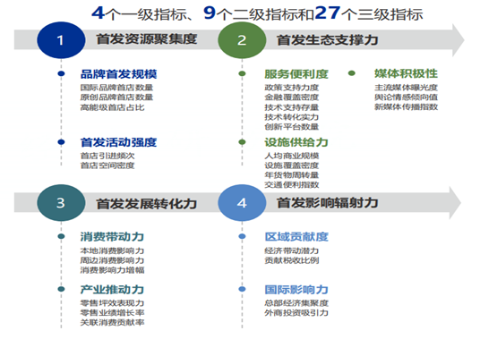 本次发布的《首发经济指数报告》(城市版)是在全国首个商圈首发经济指数报告(2025年首发经济研究院出品)基础上,进一步完善指标体系,拓展评估范围(涵盖北京、上海、成都等 9 个全国重点城市),构建起包含首发资源聚集度、首发生态支撑力、首发发展转化力和首发影响辐射力4个维度、9个二级指标、27个三级指标的科学评价框架,通过多源数据采集与严谨模型验证及交叉分析,系统刻画了全国首发经济发展格局,为城市政策制定与产业生态优化提供了量化支撑。
