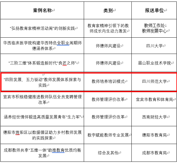 近日,在教育部教师工作司指导下,由中国教育报刊社征集编制的“新时代高水平教师队伍建设创新案例(2025)”正式发布,系统收录了全国各地教育行政部门及高校在教师队伍建设中的典型经验与创新实践内容,案例内容涵盖“教育家精神引领下的教师成长内生动力激发”“师德师风建设”“教师培养培训模式”“教师管理评价改革”“数字赋能教师专业发展”等领域。四川省共有8个案例入选,我校报送的案例《四川师范大学构建“四阶发展,五力驱动”教师发展体系探索与实践》成功入选。