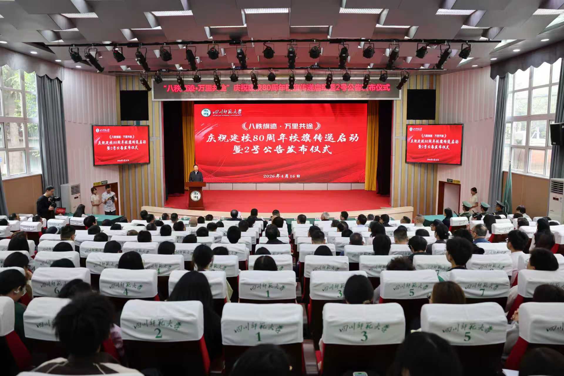 赵国华宣读了《四川师范大学建校80周年活动公告(第2号)》。为庆祝学校80华诞,中国邮政与我校合作发行《四川师范大学建校八十周年》纪念邮票及配套邮折。邮票主图为校徽,附图采用八十周年专属标识;三折邮折徐徐展开,狮子山校区的厚重、成龙校区的活力、遂宁校区的朝气遥相辉映,共同诉说着学校的底蕴与未来。这份独特的纪念品,是对学校八十年奋斗历程的一份特殊致敬。