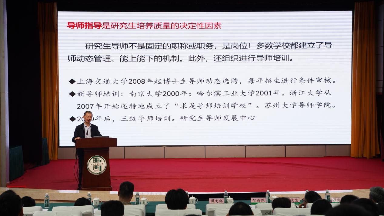 研究生院副院长谢建华作总结,并就导师相关要求进行政策解读。他结合自身指导经验,分享了与学生相处的心得体会,强调新时代研究生的成长环境与规律已发生新变化,希望各位导师因材施教,充分尊重研究生的身心发展特点,投入更多精力做好指导工作。