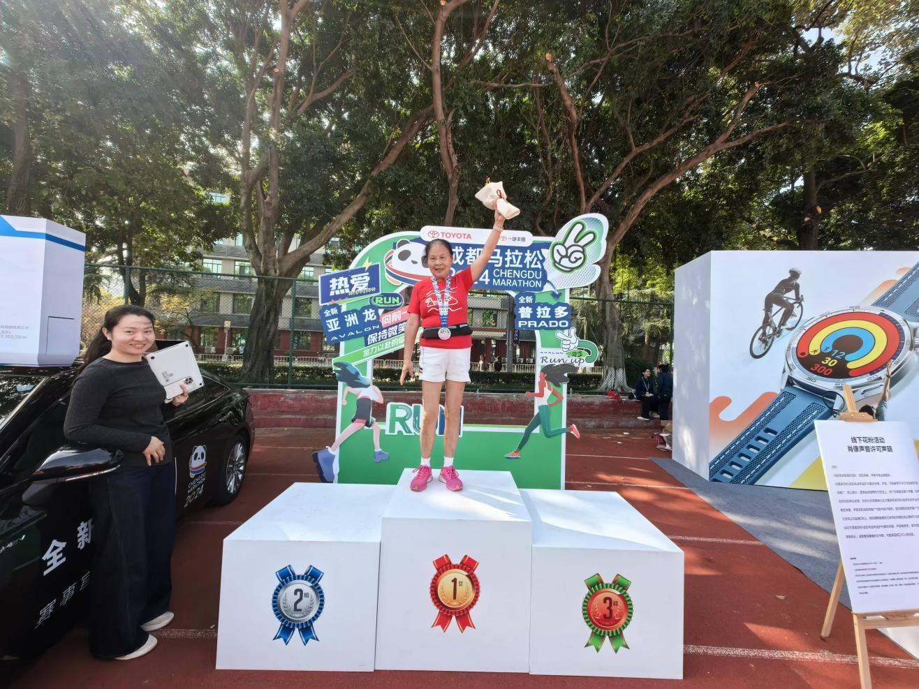 2023年,周老师加入了四川师范大学马拉松跑战队群。在这个生机勃勃、积极向上、有爱有温度的群体里,作为年龄最大的跑者,她得到了跑团师生校友的关心、支持和帮助,跑步技能和耐力都得到了极大提升。周老师的月跑量从100公里提高到200公里,参加了2024成都半程马拉松、龙泉东安湖半程马拉松,2025年10月4次接力独自跑完100公里绿道,还参加了2025成都半程马拉松!在成都市锦江区举办的“我在三圣追风跑”荧光夜跑中,78岁的周芳芸教授成为一道靓丽的风景。组委会采访了她并制作了短视频。作为最年长的跑者,她用跑步诠释了“运动治愈一切”的人生哲学,获得现场跑者的阵阵喝彩,展示了川师大退休教师的风采!2026年4月12日早上,周老师从狮子山校区沿着沙河、锦江绿道跑到交子公园,绕湖再跑,随后和川师跑团部分成员一起参加了川师80周年校庆校旗传递成都点位仪式。校友们纷纷上前与周老师合影留念,对她当天奔跑20多公里参加活动的壮举赞叹不已。