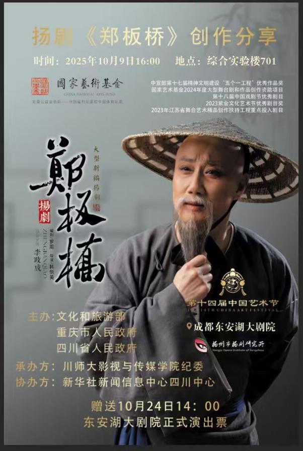 罗周从编剧与表演双重视角,系统解析了《郑板桥》的创作逻辑与艺术价值,构建“剧种历史—作品创作—舞台呈现”三维框架。同时,结合郑板桥山东放粮赈灾等史实与诗画作品,阐释其“一枝一叶总关情”的为民情怀与廉洁思想。