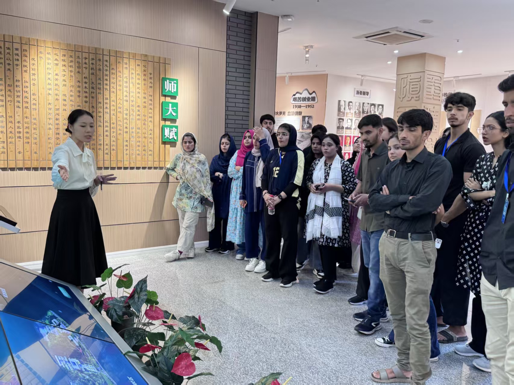 讲解以时间为主线,结合馆藏珍贵史料,系统介绍了学校的发展历程、办学成就与未来规划,生动展现办学特色与文化底蕴。巴基斯坦学生认真聆听、积极互动,并就校史重要节点进行提问,现场气氛热烈。